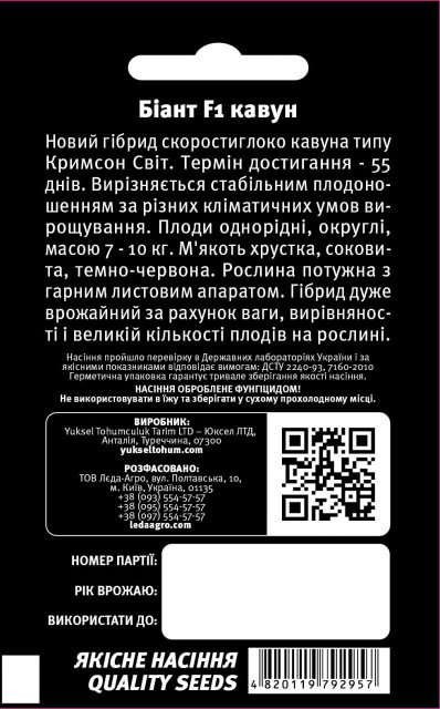 turkey Упаковка МиниСрок созревания РаннийЦвет КрасныйПроизводитель Yüksel SeedsАрбуз Биант F1 5 семян. L