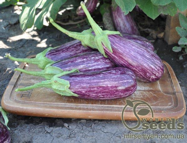 Плоды - красно-фиолетовые с белыми полосами, блестящие, овальные, ровные, длинной 16-18 см, массой 300-350 г.
