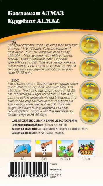 Баклажан Алмаз -Среднеспелый сорт - 110-150 дней от всходов до уборки урожая.