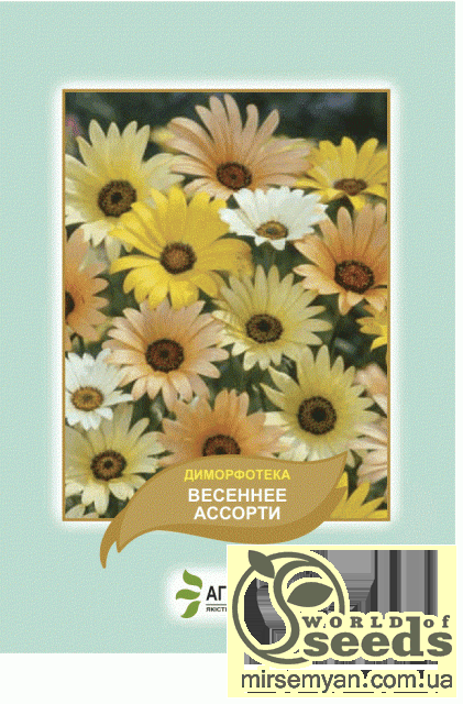 Диморфотека “Весеннее ассорти” - однолетнее растение высотой до 30 см. Соцветия - корзинки различной окраски: оранжевые, желтые, розовые или белые, с бросающими в глаза темным центральным диском. В пасмурную погоду соцветия закрываются. Цветет с июня по сентябрь. Прекрасный цветок для каменистых горок, клумб и оконных контейнеров. Семена сеют в апреле-июне в открытый грунт, или в марте-апреле на рассаду. Рассаду высаживают в открытый грунт в конце мая начало июня. Для продления цветения отцветшие соцветия периодически срезают