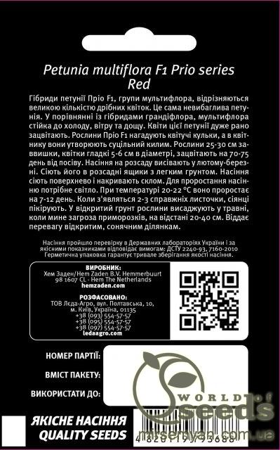 Гибриды петунии Прио F1 группы мультифлора отличаются большим количеством мелких цветков. Это самая неприхотливая петуния. По сравнению с гибридами грандифлора, мультифлора устойчива к холоду, ветра и дождя. Цветы этой петунии очень рано зацветают. Растения Прио F1 напоминают цветущие шарики, а в цветнике они образуют сплошной ковер. Растения 25-30 см высотой, цветки гладкие 5-6 см в диаметре, зацветают на 70-75 день от посева. Семена на рассаду высевают в феврале-марте. Сеют его в рассадные ящики с легкой почвой. Семена сеют поверхностно и накрывают стеклом. Для прорастания семенам нужен свет. При температуре 20-22 ° С оно прорастает на 7-12 день. Когда появятся 2-3 настоящих листочка, сеянцы пикируют. В открытый грунт растения высаживают в мае, когда минует угроза заморозков на расстоянии 20-40 см. Предпочитает открытые, солнечные участки. Hem Zaden B.V. является частной компанией, основанной в 1918 году в Хем, небольшой деревне, расположенной недалеко от Энхуйзена в Вест-Фрисландии (Нидерланды), где находится голландская семенная промышленность. Специализируется на производстве и оптовой продаже семян цветков и семян трав всех видов. Более 3000 видов однолетних, двухлетних и многолетних сортов цветов. Это делает Hem Zaden крупнейшим в мире производителем семян цветов. В течение производственного периода культура контролируется на регулярной основе хорошо обученным персоналом для обеспечения высокого качества семян.