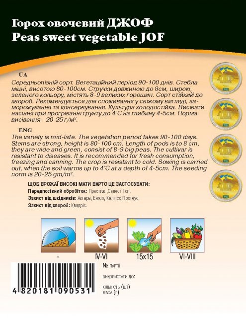 World of Seeds ukraine Упаковка МиниСрок созревания СреднепозднийЦвет ЗеленыйПроизводитель World of Seeds SyngentaГорох Джоф 20г WoS