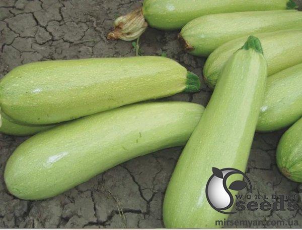 Кабачки красивой цилиндрической формы, одинаковые по размеру, кожура светло-зеленая.