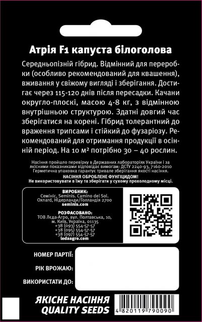 Упаковка МиниСрок созревания СреднепозднийПроизводитель SeminisКапуста Атрия F1 20 семян. L