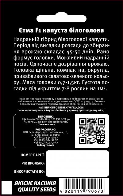 Упаковка МиниСрок созревания РаннийЦвет ЗеленыйПроизводитель Rijk ZwaanКапуста Этма F1 20 семян. L