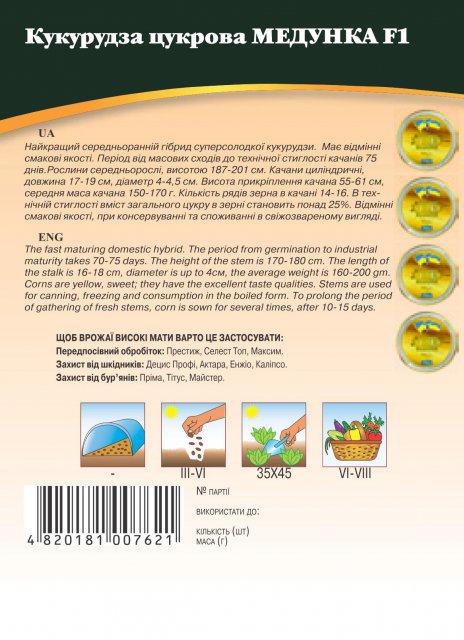 Кукуруза «Медунка» F1 известна своей устойчивостью к заболеваниям, поэтому семенной материал этого гибрида всегда имеет большой спрос. Интернет-магазин семян «Сучасна дача» предлагает выбрать семена НК Элит с тем, чтобы получить отменный урожай на приусадебном участке. Кукуруза «Медунка» F1 является среднеранним гибридом, который имеет период вегетации примерно 75 дней. Он считается лидером среди гибридов, имеющих зерна белого цвета. Высота каждого из растений достигает 200 см, а цилиндрические початки вырастают до 19 см и в своей массе достигают 170 г. С 1 м2 можно собрать урожай около 1,2 кг зерна. Само зерно имеет великолепные вкусовые качества, прекрасно консервируется и замораживается. В нем содержится большое (до 25%) количество сахаров, что делает продукт очень сладким. Культура считается засухоустойчивой и стойкой к полеганию. Для длительного получения урожая молодых початков семенной материал высевают несколько раз, с интервалом в 10 дней. «Медунка» считается прекрасным лакомством не только для детей, но и для взрослых.
