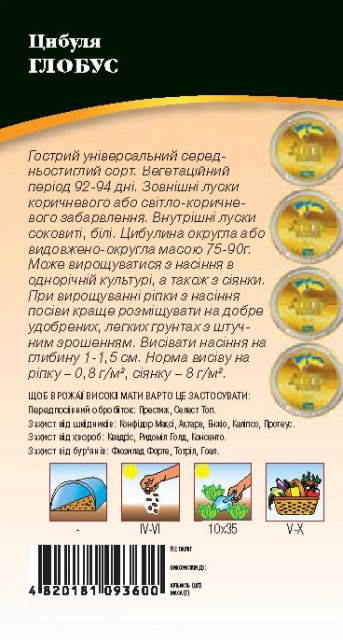 Лук "Глобус" Среднепоздний сорт репчатого лука. Возделывается из семян в однолетней культуре. Вегетационный период от посева до сбора урожая – 92-94 дня. Луковица овальной формы, внешние чешуйки коричневые или светло-коричневые, внутренние – белые со светло салатным оттенком, сочные. Вес луковицы – 75-90 гр. Вкус острый. Характеризуется одновременным созраванием. Пригоден для длительного хранения. Универсального использования