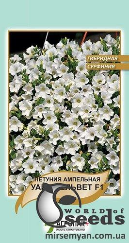 У петунии “Уайт Вельвет F1” цветки белой окраски, среднего размера 5,5-6 см. Растение характеризуется устойчивостью к вредителям и болезням, а также высокой всхожестью семян. С успехом используется там, где подчеркивается ее каскадный характер (в кашпо, подвесных корзинах и для оформления). Длиной своих превосходных свисающих побегов, достигающих 100 см, она может смело конкурировать с сортами, размножаемыми вегетативно. Через короткий период времени растения срастаются, и образуют ковер цветков высотой 25 см. Регулярные подкормки положительно влияют на длину побегов. При посеве семена землей не заделывают, емкость прикрывают пленкой и ставят в теплое освещенное место. Всходы появляются через 4-6 дней при температуре 24-25оС. В этот период очень важно поддерживать постоянную влажность почвы, пересыхание замедляет процесс прорастания, и так же убирать конденсат с пленки. После прорастания сеянцы содержат при температуре 17-18оС. В фазе двух настоящих листьев, сеянцы пикируют. Рассаду закаливают. Когда минует угроза весенних заморозков рассаду высаживают на постоянное место, выдерживая растояние между растениями 15-20см. Полив умеренный. Подкормки полным минеральным удобрением, рыхление почвы, прополка способствуют лучшему росту и цветению. Для продления цветения отцветшие цветки отщипывают.