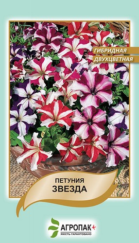 Петуния гибридная двухцветная “Звезда F1” – это очень популярная раннецветущая серия с большими 7-10 см двухцветными цветками различной окраски. Серия тщательно отобрана по продолжительности цветения цветка – 9-11 дней. Растения компактные, около 35-40 см с превосходным ветвлением от основания, с очень пышным цветением. Семена-драже в микропробирке.