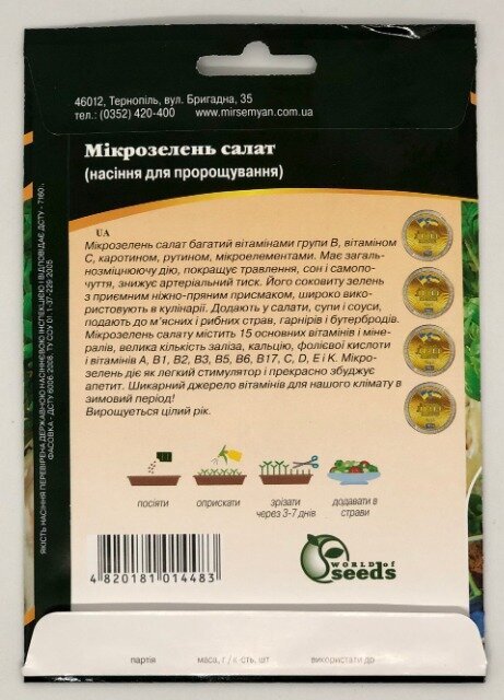 World of Seeds Упаковка МиниСрок созревания Ультраранний РаннийПроизводитель World of SeedsМикрозелень Салат 10г WoS