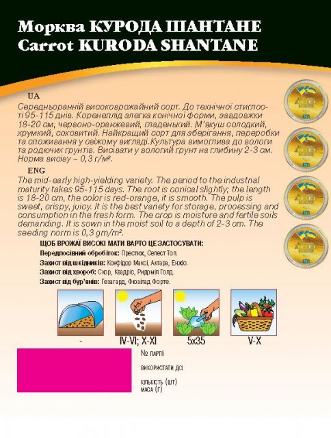 Морковь Курода Шантане Среднеранний высокоурожайный сорт. До технической спелости 95-115 дней. Корнеплод слегка конической формы, длиной 18-20 см, красно-оранжевый, гладкий. Мякоть сладкая, хрустящая, сочная. Лучший сорт для хранения, переработки и потребления в свежем вигляди.Культура требовательна к влаге и плодородных почв. Высевать во влажную почву на глубину 2-3 см. Норма высева - 0,3 г / м².