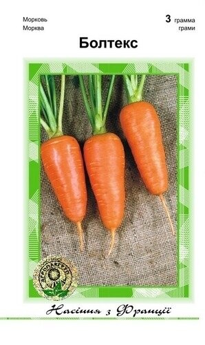 Морковь Болтекс - усовершенствованный сорт типа Шантане среднепозднего срока созревания (120-125 дней). Очень гладкие корнеплоды конической формы. Насыщенный оранжевый цвет и умеренная устойчивость к цветушности. Популярен своей высокой урожайностью и высокими вкусовыми качествами. Длина корнеплода 10-15см, диаметр 3,5-5 см, вес – 200-350 г. Предназначен для потребления в свежем виде, переработки и длительного хранения. Урожайность до 100 т/га.