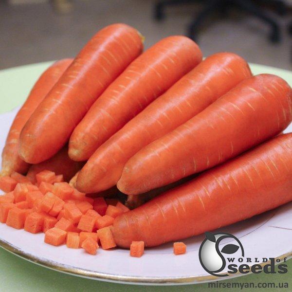 Корнеплоды - гладкие, сочные, интенсивно-оранжевого цвета, довжиною12-15 см, в диаметре 4-6 см.