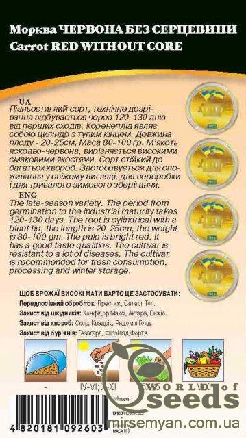 World of Seeds ukraine Упаковка ВесовыеСрок созревания ПозднийЦвет КрасныйПроизводитель World of SeedsМорковь Красная без сердцевины, кг