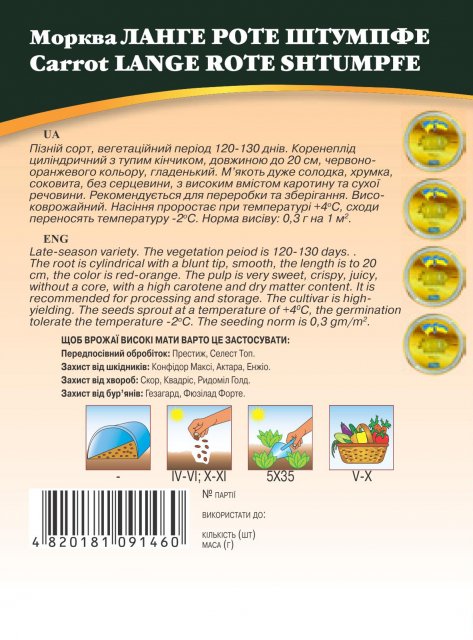 World of Seeds ukraine Упаковка МиниСрок созревания СреднераннийЦвет КрасныйПроизводитель World of SeedsМорковь Ланге Роте 2г WoS