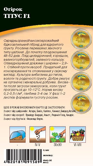 World of Seeds ukraine Упаковка МиниСрок созревания СреднераннийЦвет ЗеленыйПроизводитель World of SeedsОгурец Титус F1 0,5г WoS
