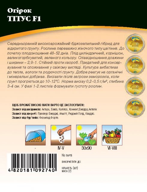 World of Seeds ukraine Упаковка МиниСрок созревания СреднераннийЦвет ЗеленыйПроизводитель World of SeedsОгурец Титус F1 4г WoS