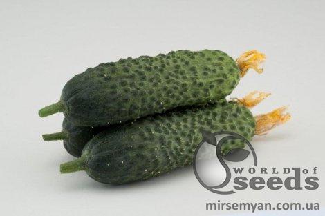 Плоды - однородные, цилиндрические, темно-зеленые, длинною 9-12 см, без белого кончика, с абсолютными засолочными качествами и отличной транспортабельностью. Имеют крупнобугорчастую поверхность и правильную цилиндрическую форму. Что характерно, даже в конце плодоношения огурцов гибрид не обзаводится пустотами, не набирает горечи, не желтеет.