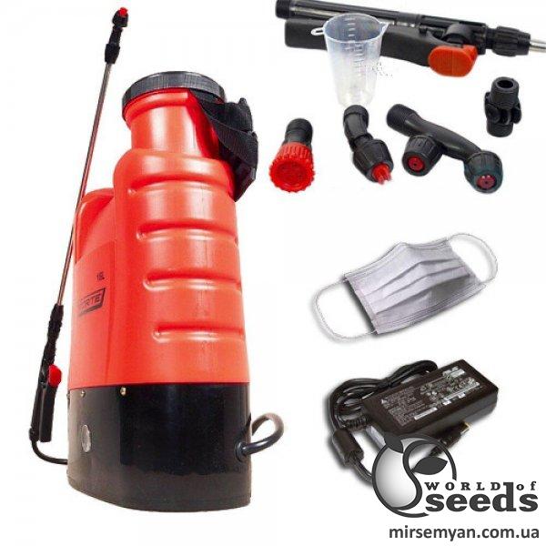 - в комплекте с аккумуляторным опрыскивателем есть зарядное устройство для его батареи, специальный мерный стакан, маска для защиты дыхательных органов, 3 сопла для более качественного распыления жидкости.