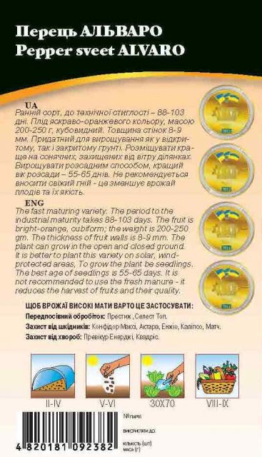 Ранний сорт, до технической спелости - 88-103 дней. Плод ярко-оранжевого цвета, массой 200-250 г, кубовидный. Толщина стенок 8-9 мм. Пригоден для выращивания как в открытом, так и закрытом грунте. Размещать лучше на солнечных, защищенных от ветра участках. Выращивать рассадным способом, лучший возраст рассады - 55-65 дней. Не рекомендуется вносить свежий навоз - это уменьшает урожай плодов и их качество.