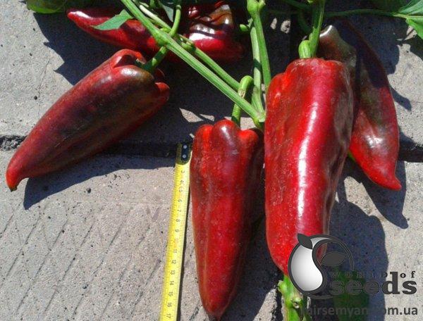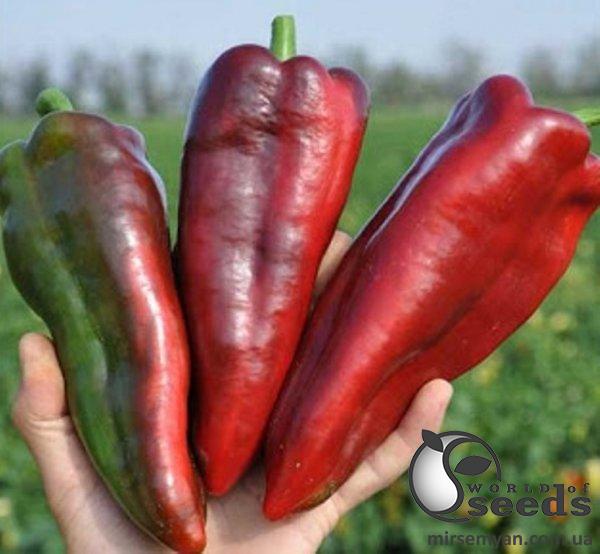 Назначение: для выращивания в пленочных тоннелях, открытом грунте. Идеальный для свежего рынка и переработки, используется в солениях. Качество плода: 140-160 г. 16х7 см. Толстая стенка. Темно-зеленый, ярко-красный. Генетически стойкий к вершинной гнили. Растение: куст среднемощный, высота 55 см. Корневая система сильная, хорошо развитая. Выдерживает загущенную схему выращивания. Особенности: отличные вкусовые качества! Высокий и стабильный урожай.