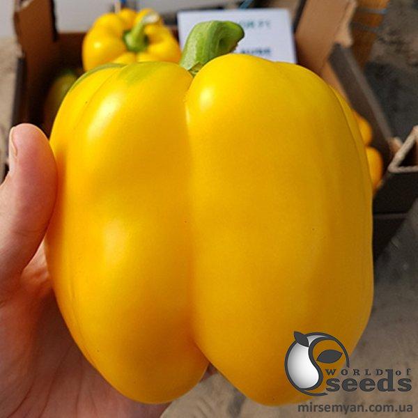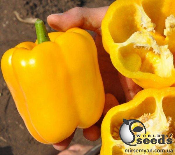 Мощное растение с широкими листьями, отличное укрытие. Привлекательный насыщенный ярко-желтый цвет. Блочный тип, большие 4-х камерные плоды, 9х10 см. Средний вес 200-220 г. Небольшая семенная камера. Толстая стенка, очень сладкий. Прекрасное хранения и транспортабельность. Оптимально подойдет для открытого грунта. Широкий пакет устойчивости.