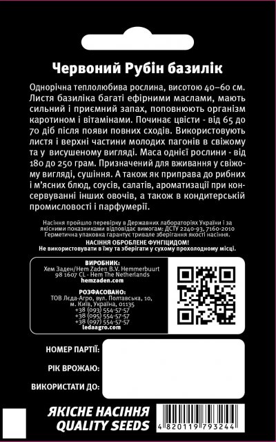 netherlands Упаковка МиниЦвет КрасныйПроизводитель Hem Zaden B.V.Базилик Красный Рубин 0,3г. L