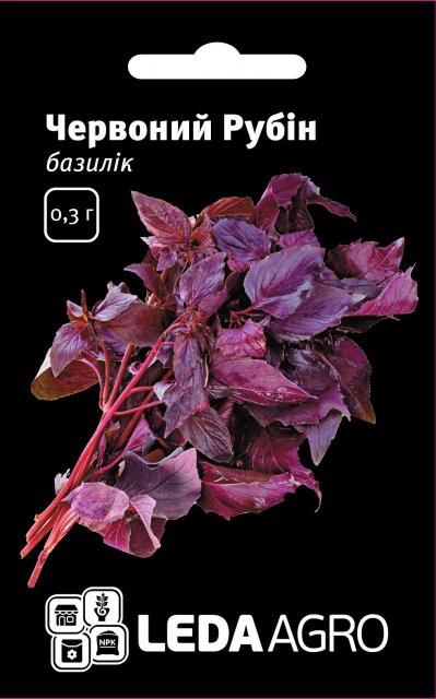 Базилик красный Красный Рубин, Однолетнее теплолюбивое растение, высотой 40- 60 см. Листья базилика богаты эфирное масло, имеют сильный и приятный запах, пополняют организм каротином и витаминами. Начинает цвести - от 65 до 70 суток после появления полных всходов. Используют листья и верхние части молодых побегов в свежем и в высушенном виде. Масса одного растения - от 180 до 250 граммов. Предназначается для употребления в свежем виде, сушиння.А также как приправу к рыбным и мясным блюдам, соусам, салатам, ароматизации при консервировании других овощей, а также в кондитерской промышленности и парфюмерии.