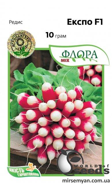 Экспо F1 Вегетационный период 18-22 дней Всесезонный гибрид для выращивания в открытом и закрытом грунте Рекомендуемая норма высева 230-270 семян на 1 кв. м. Раннеспелый, устойчивый к стрессам гибрид редиса Типа Французский завтрак. Листовой аппарат темно-зеленого цвета, длиной 15 см. Плоды однородные, цилиндрической формы длиной 5-7 см и диаметром 3-4 см, темно-красного цвета с белым кончиком (соотношение 1: 3). На протяжении долгого времени сохраняют товарный вид и блеск после мойки. Мякоть плотная, белая, не склонен к образованию пустот. Гибрид Экспо F1 устойчив к стрелкованию и ложной мучнистой росе.
