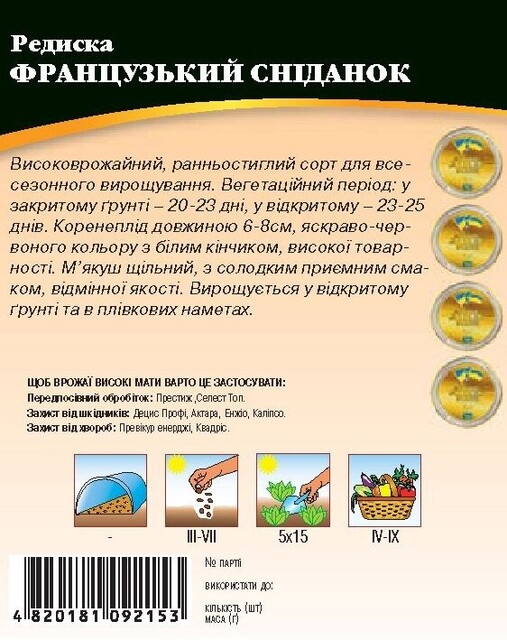 Ультра ранний сорт для всесезонного выращивания. Вегетационный период от всходов до технической спелости у закрытом грунте 20-23 дня, у открытом - 23-25 дня. Корнеплод длинною 6-8 см, ярко-красного цвета с белым кончикоми, товарность - высокая. мякиш - плотная, с сладким приятным вкусом, отменного качества. Сорт не склонен к раннему выпуска семенных ростков.