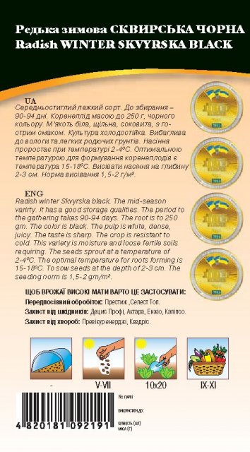 World of Seeds ukraine Упаковка МиниСрок созревания Среднеранний СреднеспелыйЦвет КрасныйПроизводитель World of SeedsРедька Сквирская черная (зимняя) 3г WoS