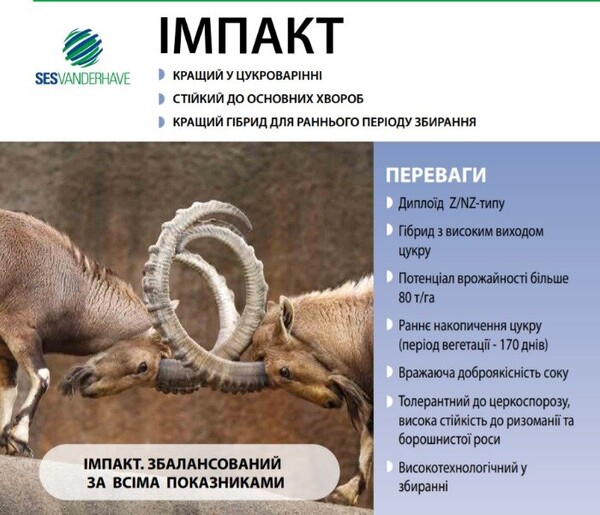 ИМПАКТ- СБАЛАНСИРОВАННЫЙ по всем показателям Лучший в сахароварении Устойчив к основным болезням Лучший гибрид длярннего перида сбора ЕГО ПРЕИМУЩЕСТВА ИМПАКТ- СБАЛАНСИРОВАН по всем показателям ИМПАКТ * Диплоид Z / NZ-типа * Гибрид с высоким выходом сахара * Потенциал урожайности больше 80т / га * Раннее накопления сахара (Период вегетации - 170 дней) * Впечатляющая доброкачественность сока * Толерантен к церкоспороза, высокая устойчивость к ризомании и мучнистой росы * Высокотехнологичный в сборе. Семена обработаны высококачественным протравители Пончо Бета (Bayer), упаковано в коробки массой нетто 1 кг., Что соответствует следующему количеству: • для дражованого обработанного протравители семян - 40 тыс. Шт. семян (± 5%), • для инкрустированного (не дражованых) семян, обработанных протравителем - 55 тыс. Шт. семян (± 5%). Семена имеют зеленый цвет. Размер фракции дражованого семян - 3,5-4,75 мм. Показатели качества соответствуют ДСТУ 3226-95 и составляют: • Всхожесть> 90%; • Выравненность> 94%; • Чистота семян> 99%; • Одноростковость> 95%; • Влажность <10%.
