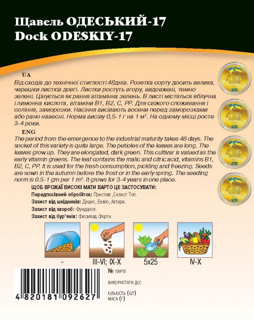 World of Seeds ukraine Упаковка МиниСрок созревания РаннийЦвет ЗеленыйПроизводитель World of SeedsЩавель Одесский-17 5г WoS