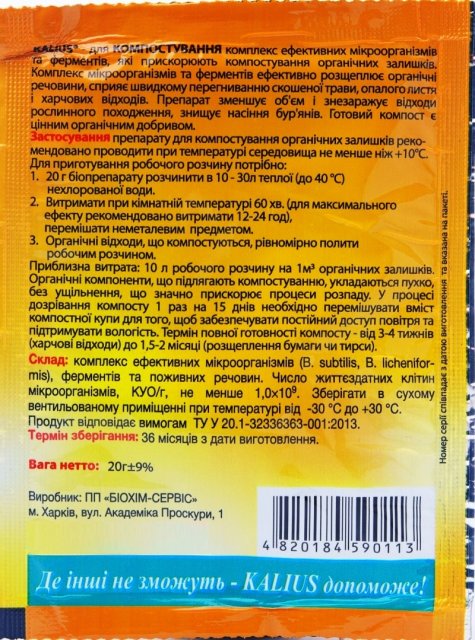 Калиус для компостирования - многокомпонентный комплекс молочнокислых бактерий, ферментов и микроорганизмов. Применяется для биодеструкции и утилизации органических отходов и растительных остатков при компостировании.