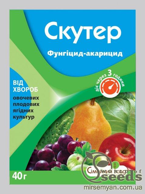 Фунгицид Скутер Контактный фунгицид-акарицид для защиты от мучнистой росы и клещей. Характеризуется быстрым интенсивным действием и идеальной растворимостью в воде: однородный раствор хорошо удерживается на обработанной поверхности. Имеет дополнительную акарицидном свойство. Препаративная форма: водорастворимые гранулы (ВГ) Действующее вещество: сера, 800г / кг Классификация ВОЗ: III класс (умеренно токсичен) Площадь обработки 40 г. - 1-2 сотки. Упаковка: 40 г, 200 г