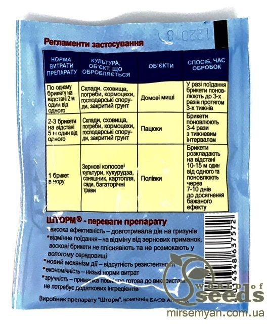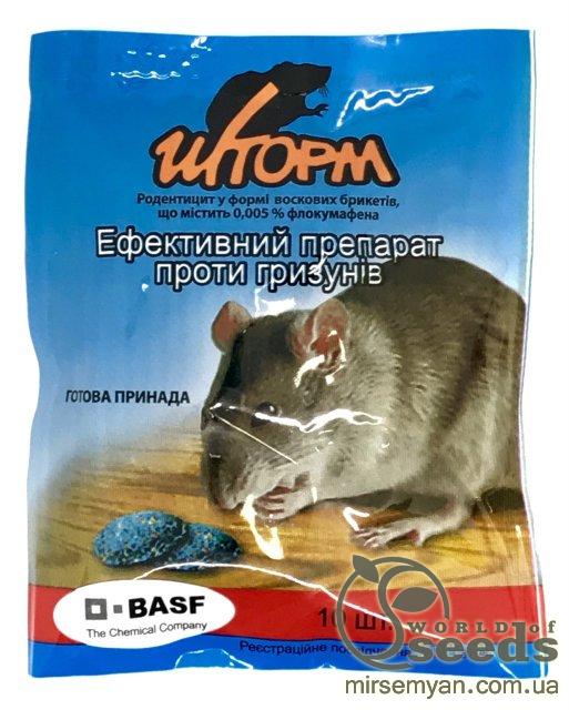 Шторм - высокомощный антикоагулянтный родентицид , эффективный против широкого спектра грызунов — вредителей, включая крыс, мышей, песчанок полевок и др. Препарат уничтожает даже те штаммы грызунов-вредителей, которые устойчивы к другим антикоагулянтным родентицидам. Исследования в СНГ и широкая практика применения препарата во многих странах мира показали, что шторм в виде различных приманочных препаратов, в том числе и восковых брикетов, обладает хорошей поедаемостью. Этот факт, а также замедленное развитие симптомов отравления предотвращают развитие приманкобоязни. Шторм - эффективный одноразовый родентицид, так летальная его доза может быть съедена грызуном как часть рациона лишь одного дня. Благодаря этому свойству препарат может применяться методом пульсационного травления, при котором достигается высокий уровень гибели даже трудно искоренимых грызунов вредителей. Шторм рекомендуется для применения в: - зернохранилищах и других складских помещениях; - кормоцехах животноводческих ферм; - сооружениях защищенного грунта (теплицы, парники и др.); - коммунальном хозяйстве (общественные и жилые помещения, промышленные объекты); - погребах и других хозяйственных постройках; - полевых условиях, в том числе в садах.