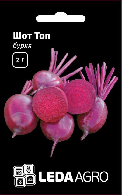 Свекла столовая сорт Шот Топ изготавливается хорошо известными французскими производителями. Семена данного сорта дают первый урожай уже на 115-120 день. Корнеплоды Шот Топ отличаются правильной округлой формой, полностью однородные по своему размеру, равномерного бордового цвета без радиальных колец. Продукт высокого качества, гарантированно дает отличный урожай.