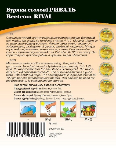 World of Seeds ukraine Упаковка МиниСрок созревания СреднеспелыйЦвет КрасныйФорма плода ЦилиндрическийПроизводитель World of SeedsСвекла Риваль 10г WoS