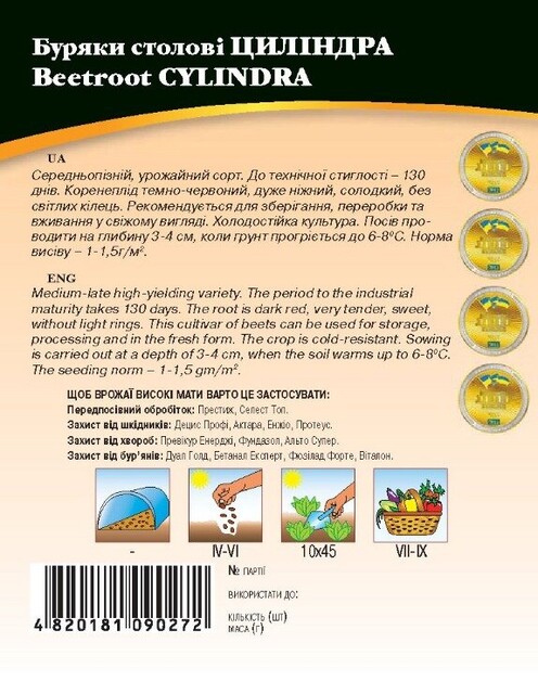 Среднепоздний, урожайный сорт. До технической спелости - 130 дней. Корнеплод темно-красный, очень нежный, сладкий, без светлых колец. Рекомендуется для хранения, переработки и употребления в свежем виде. Холодостойкое культура. Хорошо растет на удобренных, плодородных, легких почвах. Посев проводить на глубину 3-4 см, когда почва прогреется до 6-8ºС. Норма высева - 1-1,5 г / м2. Особенно нуждается во влаге в период прорастания семян, образования и роста корнеплодов.