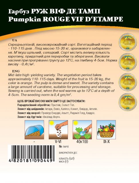 World of Seeds ukraine Упаковка МиниСрок созревания СреднераннийЦвет КрасныйПроизводитель World of SeedsТыква Руж Виф Де Тамп 10г WoS