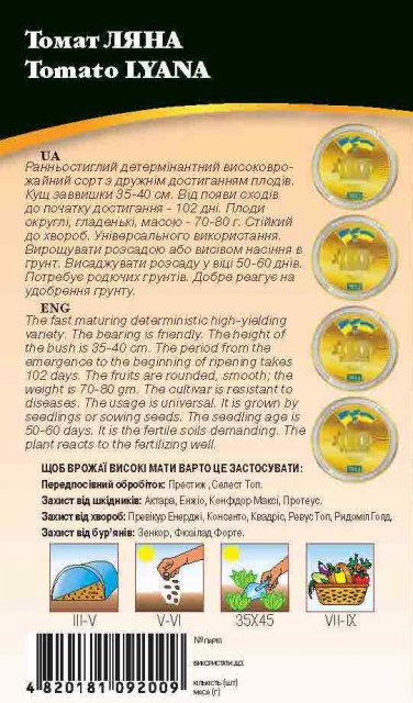 Растения детерминантные,среднеетвистые, высотой 35-40 см. Первые соцветия закладываются над 5-6 листом, далее через 1-2 листа. Урожайность - 4,5-6 кг/кв.м. Особенности агротехники: для открытого грунта и пленочных теплиц. Рекомендуемая густота посадки 3,5 растения на 1 кв.м. Возможен посев семян в грунт при температуре почвы не ниже плюс 10 градусов. Культуру следует вести в один стебель и своевременно пасынковать. Сроки созревания: ультраскороспелый: период от всходов до созревания 87-93 дня. Плоды округлые, гладкие, ярко-красные, транспортабельные, массой 70-80 г , 2-3-х камерные, содержат до 6% сухого вещества и 4% сахаров. Вкус плодов хороший. Устойчивость: слабо поражается болезнями. Хорошо завязывает плоды при перепадах температур. Использование: для потребления в свежем виде и для переработки на томат-пасту, сок, для консервирования и засолки. Долго сохраняют плотную консистенцию во время хранения. Растения сорта Ляна невысокие, компактные, поэтому сорт подходит для возделывания на небольших огородах и в малогабаритных теплицах. Благодаря тому, что сорт очень ранний, его возможно выращивать посевом семян в грунт, не затрачивая сил на выращивание рассады. Устойчивость сорта Ляна к изменениям температуры позволяет получать высокие урожаи, даже при неблагоприятных погодных условиях. Плоды с повышенным содержанием сухого вещества и сахаров особенно хороши для переработки на пасту, сок и детское питание.
