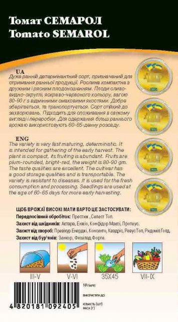 Семена томата "Семарол" Чешской селекции компании СЕМО Очень ранний детерминантный сорт, предназначенный для получения ранней продукции. Растение компактное с дружным и обильным плодоношением. Плоды сливовидные-округлые, ярко-красного цвета, весом 80-90 г с отличными вкусовыми качествами. Хорошо сохраняется, и транспортируется. Сорт устойчив к заболеваниям. Подходит для потребления в свежем виде и переработки. Для получения более раннего урожая используют 60-65-дневную рассаду.