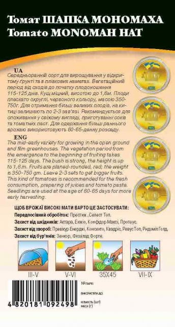Семена томата Шапка Мономаха Среднеранний сорт для выращивания в открытом грунте и в пленочных укрытиях. Вегетационный период от всходов до начала плодоношения 115-125 дней. Куст прочный, высотой до 1,6м. Плоды плоско округлые, красного цвета, массой 350-750г. Для получения более крупных плодов на кисти оставляют по 2-3 завязи. Рекомендуется для потребления в свежем виде, приготовлении соков и томатных паст. Для получения более раннего урожая используют 60-65-дневную рассаду.
