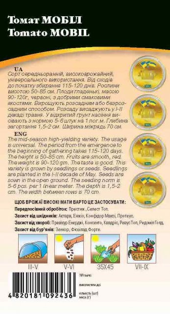 Семена томата Мобил Сорт среднеранний, высокоурожайный, универсального использования. От всходов до начала сбора 115-120 дней. Растения высотой 50-85 см. Плоды гладкие, массой 90-120г, красные, с хорошими вкусовыми качествами. Выращивают рассадным или безрассадным способом. Рассаду высаживают в I-II декаде мая. В открытый грунт семена высевают с нормой 5-6 штук на 1 пог.м. Глубина заделки 1,5-2 см. Ширина междурядий 70 см.