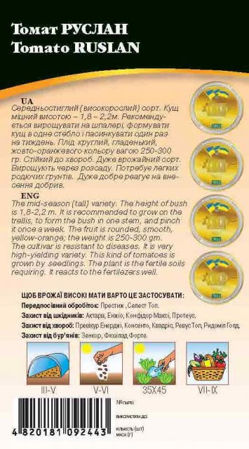 Руслан Среднеспелый (высокорослый) сорт. Куст прочный высотой - 1,8 - 2,2м. Рекомендуется выращивать на шпалере, формировать куст в один стебель и пасынковать один раз в неделю. Плод круглый, гладкий, желто-оранжевого цвета весом 250-300 гр. Устойчив к болезням. Очень урожайный сорт. Выращивают через рассаду. Требует легких плодородных почв. Очень хорошо реагирует на внесение удобрений.