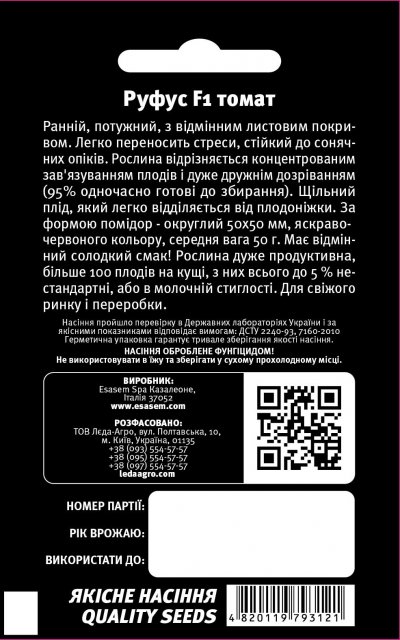 Руфус F1 20 шт Ранний, мощный, с отличным листовым покровом. Легко переносит стрессы, устойчивый к солнечным ожогам. Растение отличается концентрированным завязыванием плодов и очень дружным созреванием (95% одновременно готовы к уборке). Плотный плод, который легко отделяется от плодоножки. По форме помидор - округлый 50х50 мм, ярко-красного цвета, средний вес 50 г. Имеет отличный сладкий вкус! Растение очень продуктивна, более 100 плодов на кусте, из них всего до 5% нестандартные, или в молочной спелости. Для свежего рынка и переработки.