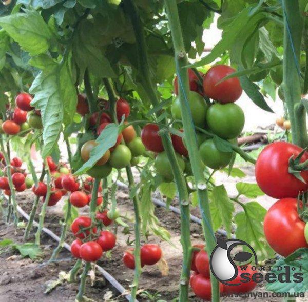 Среднеплодный индетерминантный гибрид томата. Хорошая сила роста, мощная корневая система. Короткие междоузлия, на каждой кисти 5-7 плотных плодов. Высокий выход стандартных товарных плодов отличного качества. Однородные плоды округлой формы, весом 150-170г. Привлекательный внешний вид - темно-красный цвет плодов и красивые чашелистики. Стрессоустойчивый, хорошо завязывают и развивается как при высоких, так и при низких температурах. Широкий пакет устойчивости, в том числе к кладоспориозу, мучнистой росе и вирусу курчавости листьев. Рекомендован для пленочных теплиц для первого и второго оборота