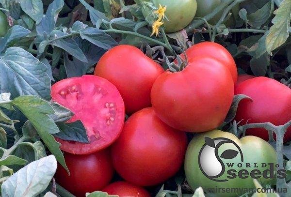 Новый урожайный крупноплодный помидор. Ранний - 60-62 дней от высадки рассады. Сильное растение, хороший листовой аппарат, хорошее укрытие плодов. Стандартные плоды округло-приплюснутой формы. Характерна высокая однородность, средний вес 250-300 г. Привлекательный ярко-красный цвет. Отличные вкусовые качества. Без зеленого пятна у плодоножки. Плотные плоды, не растрескивается. Хорошо сохраняется и транспортируется. HR: ToMV/ Va:0/ Vd:0/ Fol:0,1/ Ss; IR: TSWV:TO