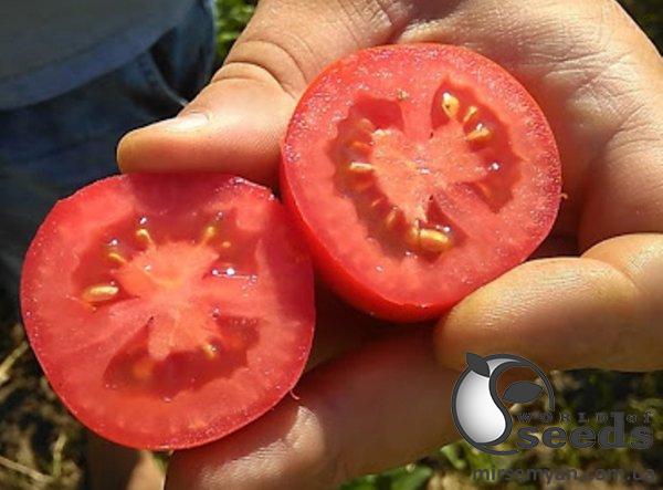 Плоды сливовидной формы ароматные, ярко-красного цвета, без зеленого пятна, прожилок и стержня внутри, выровненные по форме и размеру, мясистые, плотные, плоды имеют толстую стенку (8 мм), благодаря чему очень транспортабельны.