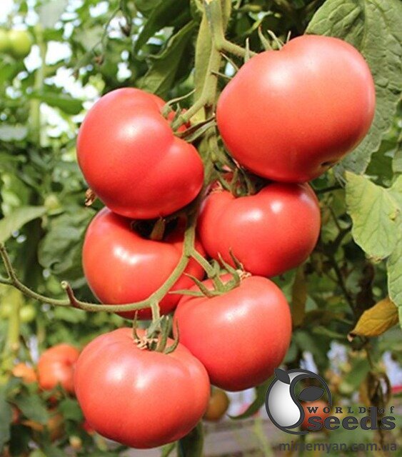 Новый ранний индетерминантный гибрид розового томата. Назначение – Пригоден для выращивания в весеннем, осеннем и удлиненном оборотах. Используется для свежего рынка. Выращивается в закрытом грунте (пленочных теплицах). Характеристики плода – Формирует на кисти по 5-6 однородных по форме и размеру плодов. Плоды округло-приплюснутой формы, привлекательного розового цвета с блеском и отличного качества. Вес – 240-260 г. Особенности растения – Растение высокое, мощное, открытое, междоузлия средней длины. Стойкость – Имеет высокую стрессоустойчивость в разных условиях выращивания. HR: ToMV: 0-2 / Ff: AE / Fol: 0,1 / For. IR: TYLCV. Конкурентные преимущества – Стабильное и регулярное получение урожая в течение всего периода выращивания. Высокая устойчивость к растрескиванию плодов и длительный период хранения.